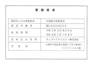 警備業務事業 北海道公安委員会認定 第10000953号 |